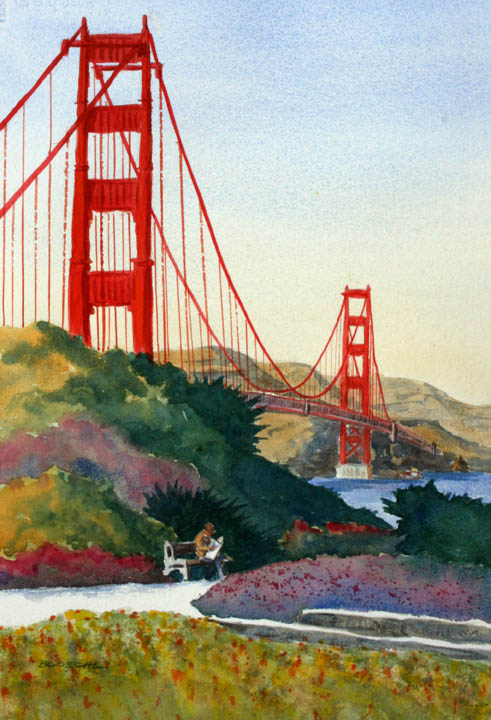 This scene is based on a photo I took at the Golden Gate Bridge overlook.